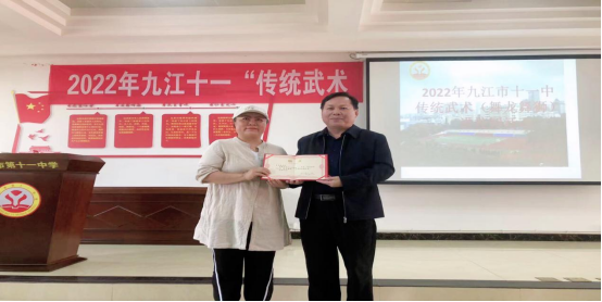 5月13日,XK星空高辛琳、李放两位教师受邀参加2022年九江市第十一中学“传统武术(舞龙舞狮)进校园”活动。本次活动在九江市第十一中学多媒体报告厅举行,会上九江市十一中负责人分别为两位教师颁发传统体育进校园活动聘书。