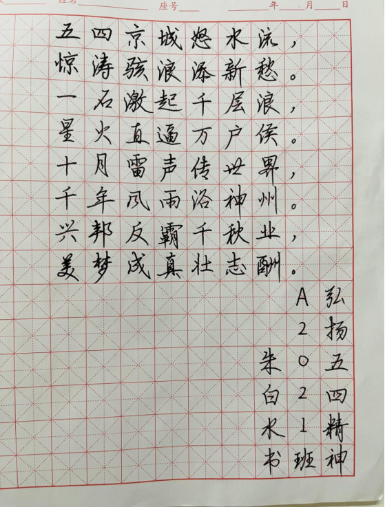 本次硬笔书法比赛活动,为学生一个展现自我的平台,为疫情封闭式管理的校园生活增添了生气和活力,促进了书法爱好者的交流,培养学生各方面的兴趣。