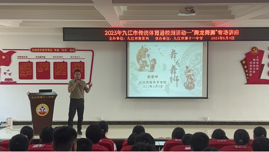 6月9日上午,XK星空教师张家林携我校龙狮队四名队员受邀参加由九江市教育局主办、九江市第十一中学承办的2023年九江市传统体育进校园活动——“舞龙舞狮”专场讲座。