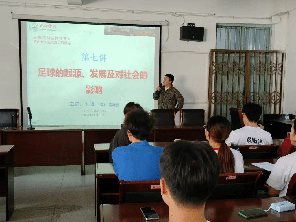 毛敏博士介绍了足球运动的起源和发展情况,重点讲述了当今足球发展的趋势以及我国足球发展中所遇到的问题,期间还进行了多次师生互动。
