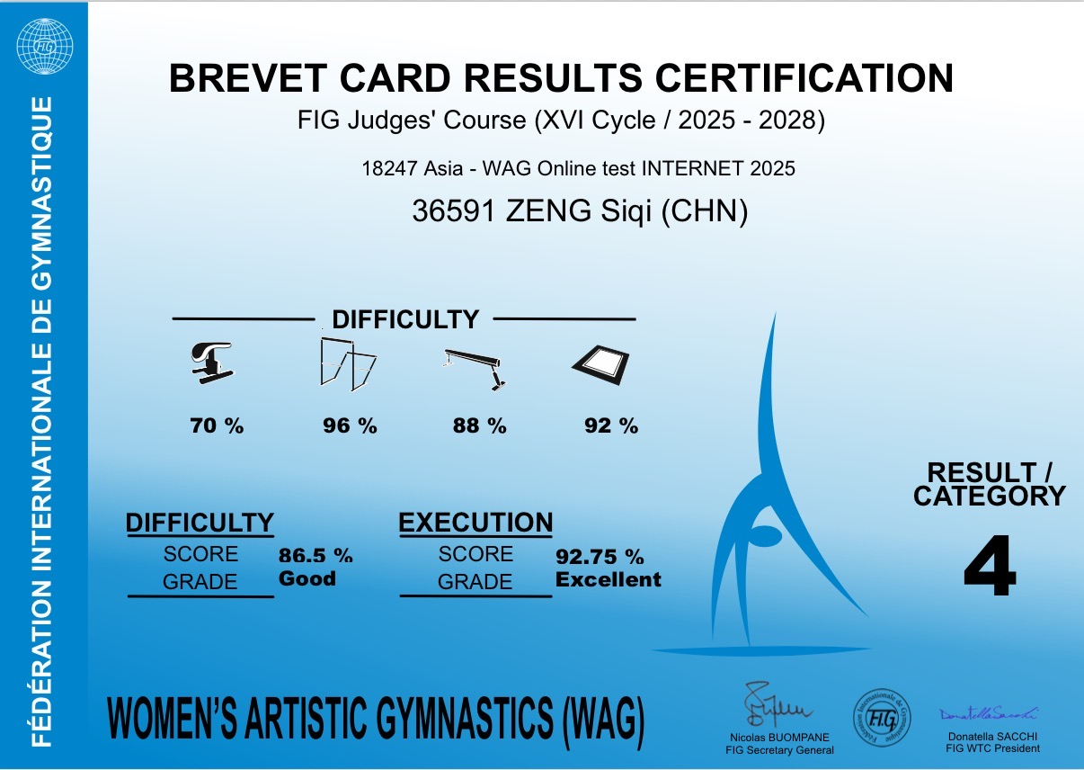 此次培训及考核由国际体操联合会亚洲体操联合会主办具体组织实施,参训人员由体育总局体操管理中心按照职业道德、业务能力、执裁经历、语言水平、对外交流能力、国内班考试成绩等多项标准综合评定后择优推荐。培训内容涵盖国际规则的最新修订、评分实践、案例研讨等多个方面,培训结束后组织了统一考试。曾斯琪老师在各项考核中表现良好,达到了国际裁判资格评定要求。