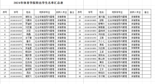 根据《星空XK官网学生转专业管理办法(试行)》九院字【2024】111号文件的规定,经过学生本人申请,且申请转出人数符合学校的规定,拟批准2024级社会体育指导与管理专业的36名学生转出申请,公示名单如下: