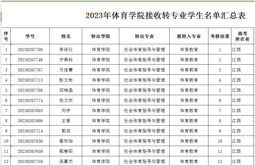 根据《星空XK官网学生转专业管理办法(试行)》2023(109)号文件的规定,经过学生本人申请,转出和转入学院对12名学生进行了资格审核和成绩排序,拟批准2023级社会体育指导与管理专业的12名学生转入体育教育专业,公示名单如下: