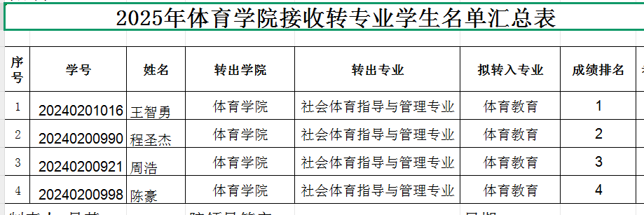 根据《星空XK官网学生转专业管理办法(试行)》九院字【2024】1体育教育专业的转入计划从高分到低分确定转入名单,拟批准2024级社会体育指导与管理专业的4名学生拟转入体育教育专业,名单公示如下: