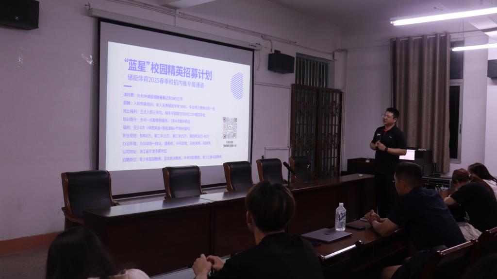 为进一步拓宽学生就业渠道,深化校企合作,助力体育专业人才高质量就业。5月14日晚,XK星空持续开展招聘就业宣讲会暨企业专场校园招聘会,本次宣讲会邀请到浙江省宁波储能体育有限公司。XK星空2025届毕业生以及2022级、2023级学生代表参加宣讲会。
