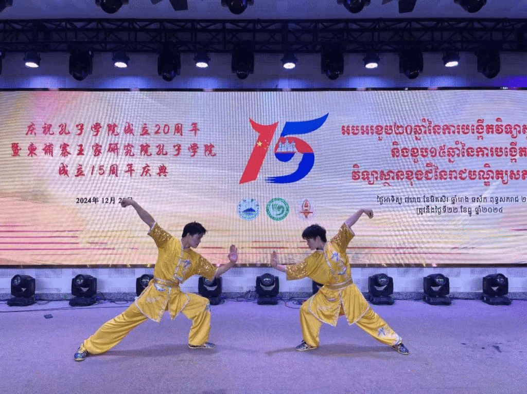 12月22日,柬埔寨王家研究院孔子学院在王家研究院高棉学者厅举办孔子学院成立20周年暨柬埔寨王家研究院孔子学院15周年庆典,郭新燕和蓝永康进行了演出,两位同学的拳术和刀术表演,体现出中国武术的独特魅力,作为一个丰盈饱满的文化载体,在一招一式中折射着中华智慧,在一拳一路中体现着中华精神,在一技一理中内隐着中华文明,武动青春是以星空XK官网武术队两名队员为代表,呈现出对中国传统武术的热爱。